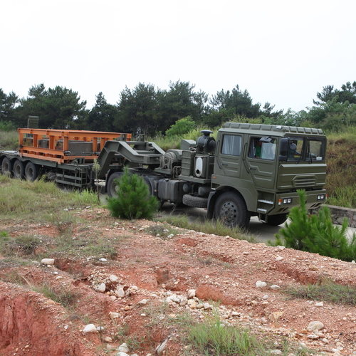 60t装备运输列车主要用于四级(含)以上公路、、急造军路上运输总重60吨以内的重型履带式车辆、轮式车辆、20英尺货运集装箱及其它工程装备等,具有牵引总重60吨以内因受损或故障而抛锚的重型履带式、轮式及其它工程车辆上下半挂车平台的能力。采用高断面工字梁结构型式、新型高强度材料车架,在越野行驶过程能确保承载能力大、安全可靠。挂车采用14t整体式车桥,前两桥承载,后两桥为随动转向桥。在车辆曲线行驶时,车轮受侧向力作用,将自动顺着曲线方向转向,提高整车转向性能。 制动系统带ABS系统,能够合理分配制动力,提高车辆制动稳定性、机动性和安全性。设有一套导轮装置和液压绞盘,方便牵引或卸下受损重型装备。