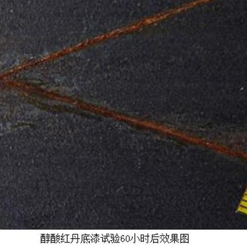 采用改性的水性丙烯酸树脂与复合转化剂搭配的新一代水性铁锈转化产品,产品为白色乳状液,涂于铁锈表面后转化为黑色有机铁高分子化合物,其对基体附着力、防腐性、与其它涂层的层间附着力等综合性能优良,完全能替代喷砂、抛丸的涂装前处理工艺,经过常州国家涂料质量监督检验中心测试,其对锈蚀的转化层经养护后盐雾试验时间达72小时(GB/T 1771-91),3%盐水浸泡时间达168小时(GB/T9274-88甲法),好于一般的防腐底漆