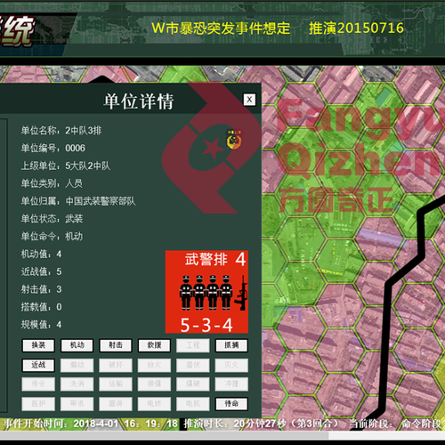 反恐指挥训练兵棋推演系统是基于武警部队非战争军事行动的基本实践。为旅、团及指挥系在处突防爆、抢险救灾等重大事件应急反应模拟训练、维稳行动一体化配合指挥训练提供的专业兵棋推演系统。立足于武警部队、各地公安应急反应的实际训练需要,在满足信息化条件下,城镇居民突发事件及各种相关险情、警情交错的环境中有针对性的开发。