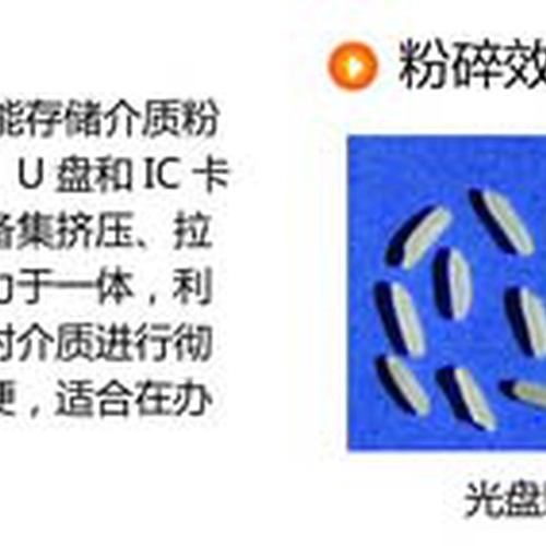信安保XBF-01E型光盘/U盘粉碎机是一款适合办公室内使用的,低噪音存储介质粉碎机,适合粉碎光盘、U盘和IC卡等存储介质。粉碎机集挤压、拉伸、切割等作用力于一体,通过二次碾压技术对介质进行彻底粉碎。该产品获得多项国家专利,在设计中使用自动清扫技术,使设备免维护,使用方便。