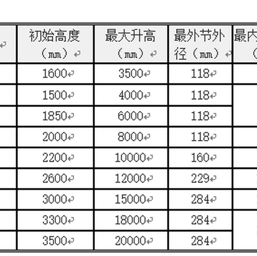 型 号 节数 初始高度(mm) 最大升高(mm) 最外节外径(mm) 最内节内径(mm) 负载(Kg) 桅杆自重(Kg)