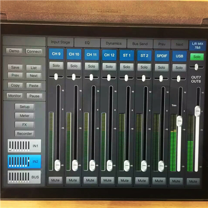 全球首款20路数字紧凑型调音台系列产品,填补市场空白,和同行业调音台相比,数字调音台触摸屏更大,触摸感更好,体积更加轻便小巧,操控更直观,功能更齐全。核心采用第四代40bit SHARC浮点处理器,24bit/48kHz模数/数模转换,内置带混响、延时、压限、EQ和GEQ效果。配备一个7寸由安卓驱动的高清触摸屏,可以进行WIFI无线控制,配合9个100mm日本ALPS电动推子调整参数,操控直观。DM20调音台=压限器+效果器+分配器+均衡器+无损播放器+无损录音机+模拟调音台。