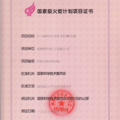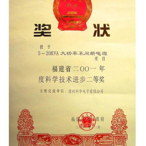 一、漳州科华早期UPS产品是从后备式开始的。1997年漳州科华在国内电源行业最早投入在线式大功率UPS开发。当年,漳州科华“5-20KVA在线式大功率UPS”列入国家重点火炬计划。2000年,漳州科华“5-20KVA在线式大功率UPS”荣获福建省科技进步二等奖,在当时国内电源界引起“轰动”。 二、经几番的技术升级和产品革新,“信息设备用高性能不间断电源”核心技术已处于国内领先水平,单机功率400KVA。 三、漳州科华“信息设备用高性能UPS”已成为拳头产品,并替代进口同类产品。科华牌高端UPS的推出,迫使国内市场的国际品牌UPS全面降价,打破国际电源品牌的高价垄断局面。