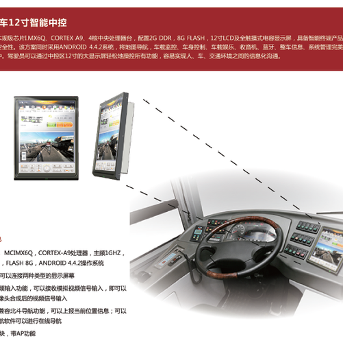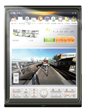 本机型的产品编号MH-M612AT1,基于Android4.4T系统开发,拥有ARM Cotex-A9四核处理器和12寸768X1024分辨率宽温级真彩色高亮LCD电容触摸屏,按车规等级设计开发,能在-40℃~85℃环境工作温度长时间稳定运行。支持北斗/GPS导航,3G及WIFI联网,蓝牙免提电话和音乐,FM收音机,多媒体音视频播放等娱乐功能,还能支持倒车后视,车身控制,空调操作,车身信息,车身故障查询及诊断等功能。本机型已经适配在国内多家知名新能源车企的主力新车型中,受到客户及最终用户的一致好评。