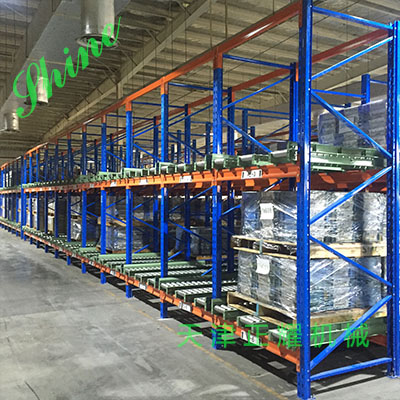 重力式货架属于先进先出的存储方式。 1、货物由高的一端存入,滑至低端,从低端取出。货物滑动过程中,滑道上设置有阻尼器,控制货物滑行速度保持在安全范围内。滑道出货一端设置有分离器,搬运机械可顺利取出第一板位置的货物。 2、货物遵循先进先出顺序。货架具有存储密度高,且具有柔性配合功能。 3、适用于以托盘为载体的存储作业,货物堆栈整齐,为大件重物的存储提供了较好的解决方案,仓储空间利用率在75%以上,而且只需要一个进出货通道; 4、重力式货架非常环保,全部采用无动力形式,无能耗,噪音低,安全可靠,可满负荷运作。