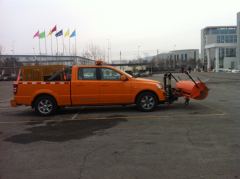 AD5030TCX型除雪车能快速清除冰雪,保证道路交通安全畅通,是您冬雪时节的好伙伴,它具有与众不同的功能:除雪速度快,前置除雪滚刷清除新降浮雪便捷彻底。除雪铲可左右摆动,将除雪铲向右(或左)摆动0~300角,此时开动除雪车,即可将雪抛向右边(或左边);前置扫雪滚刷主要用于清扫60mm以下的新降浮雪,安装于皮卡汽车前部。其安装采用挂板结构,可快速拆卸。适用于高速清除市内道路和机场、广场的新降积雪。