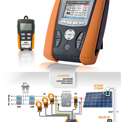 HT SOLAR300N是太阳能光伏系统性能验证与电能质量分析测试仪,SOLAR300N是可以执行所有的建议性测试,可以检查单相和三相光电装置的仪表。SOLAR300N测量电池的直流输出功率,换流器的交流输出功率,太阳辐射和电池的温度。直流和交流的功率测量需要用户把本仪表连接到换流器的直流上下输入端。本仪表可以同时获得单相设备和三相设备有效值。通常换流器与光电电池之间的距离比较远,为了避免使用长电缆,SOLAR300N配备有远距离测量装置SOLAR-01,可以获得以下参数:太阳辐射,电池的温度和环境温度。在做最后的记录时,SOLAR-01上的值可以通过USB连接转移到SOLAR300N上。