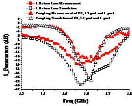该款天线利用环形介质壁与金属环加载实现较宽的辐射波束以及较高的低仰角增益;采用多天线层叠技术实现多个工作频段的集成;为了满足GPS/北斗系统中对天线圆极化辐射的要求,分别采用微带天线双馈以及切角技术实现天线的圆极化;此外,由于系统中收发隔离的需求,采用了3dB电桥实现了同一天线不同工作频率下的收发隔离。