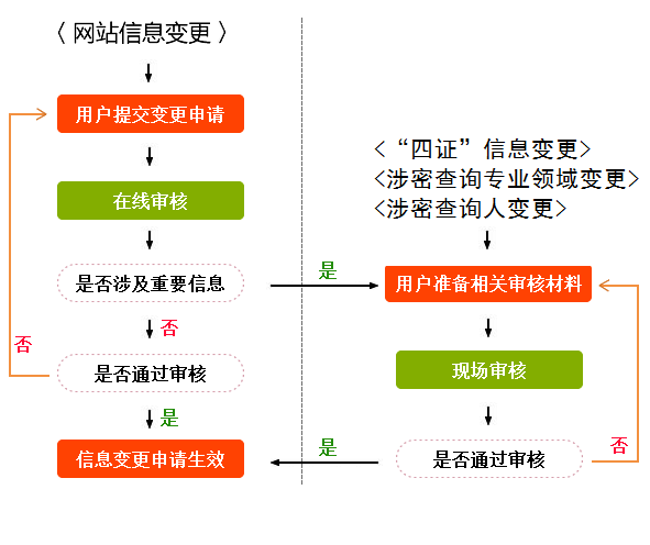 用户信息变更包括用户的网站信息、“四证”信息、涉密查询专业领域和涉密查询人变更。