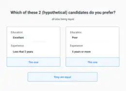 1000minds conjoint analysis surveys are for discovering consumers’ or other stakeholders’ preferences with respect to the relative importance – represented by ‘part-worth utilities’ or ‘weights’ – of the features or attributes characterizing products or other objects of interest (i.e., choice modelling, conjoint analysis and discrete choice).[4][5]