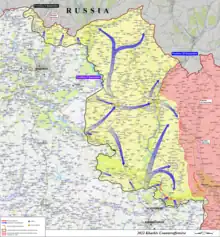 Ukrainian troops then went on the offensive in the directions of Balakliia, Volokhiv Yar, Shevchenkove, Kupiansk and the districts Savyntsi and Kunye, situated east of Balakliia. According to Russian sources on this line of contact Ukrainians were opposed in some areas of the line by lightly armed forces of the DPR Militia,[16] while Ukrainian sources said that the forces in this region were professional Russian soldiers, not conscripts from the Donbas.[43]