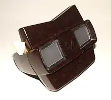 The practice of viewing film-based stereoscopic transparencies dates to at least as early as 1931, when Tru-Vue began to market sets of stereo views on strips of 35 mm film that were fed through a hand-held Bakelite viewer. In 1939, a modified and miniaturized variation of this technology, employing cardboard disks containing seven pairs of small Kodachrome color film transparencies, was introduced as the View-Master.
