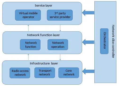 Although there are different proposals of network slice architectures,[20][21][22] it is possible to define a general architecture that maps the common elements of each solution into a general and unified framework. From a high-level perspective, the network slicing architecture can be considered as composed of two mains blocks, one dedicated to the actual slice implementation and the other dedicated to the slice management and configuration.[3] The first block is designed as a multi-tier architecture composed by three layers (service layer, network function layer, infrastructure layer), where each one contributes to the slice definition and deployment with distinct tasks. The second block is designed as a centralized network entity, generically denoted as network slice controller, that monitors and manages the functionalities between the three layers in order to efficiently coordinate the coexistence of multiple slices.[9]