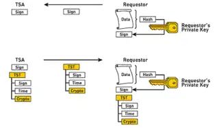 For applications using digitally signed data, the requestor signs the digital hash with its private key and submits the digital signature to the TSA, which performs the same operations as in the previous example: bind the submitted data with a timestamp using its cryptographic binding and return the results to the requestor.