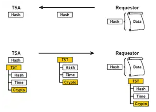 When a requestor requires a trusted timestamp for a piece of data, it creates a hash of the data using a cryptographic hash function and sends it to the TSA (through a network connection). The TSA then signs the hash and the time of signature to create a trusted timestamp. This trusted timestamp is finally returned to the requestor, who can store it along with the data.