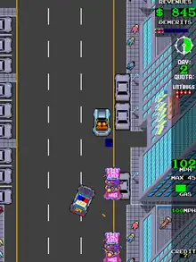 The object of the game is to meet (or exceed) the daily quota of citing or arresting various types of law-breakers within a time limit for the day. The player is given an overhead view of Officer Bob's patrol car, number 54. The player controls the car with a gas pedal and a steering wheel.[3] Bonuses are awarded for a "perfect day" and each arrest over the quota. Picking up donuts extends the day's time limit. Driving through filling stations refuels the patrol car. Driving through the "Speed Shop" garage daily upgrades the patrol car with brakes, guns, armor, radar, etc.[4]