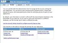 The security tab is used to create users and roles, group users under different roles and assign access rules either at the role-level or user-level.[5][6][7][8] When the Web site administration tool is opened to modify the existing settings, a new database is created in the App_Data folder of the application.[5] This database stores ASP.NET membership-related information. The name of the database created is ASPNETDB by default.[5]
