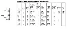 The Merlin system introduced a new wiring design of eight wires (four-pair) that allowed the system to deliver two voice paths to each desk phone so a user on an active telephone call could still receive a paging announcement on their phone’s desk speaker simultaneously. AT&T described the signaling channel on the data pair as “analog multi-line telephone protocol (40 kbps)” but no further details were made available about the protocol.[4]
