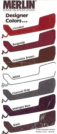 Merlin phones were offered in a variety of high-gloss plastic color choices of black, midnight blue, charcoal gray, white, chocolate brown, burgundy, and cinnabar (red). For an example of model numbers including color codes, the 7303H01D 10-Button Membrane Voice Terminal were available as: 7303H01D-03 (BLACK) 105217509, 7303H01D-58 (WHITE) 105217517, 7303HO1D-104 (BROWN) 105217525, 7303H01D-139 (GRAY) 105217533, 7303H01D-142 (MID BLUE) 105214541, 7303H01D-143 (BURGUNDY) 105217558, 7303H01D-144 (CINNABAR) 105217566, and 7303H01D-215 (MISTY) 105217608.
