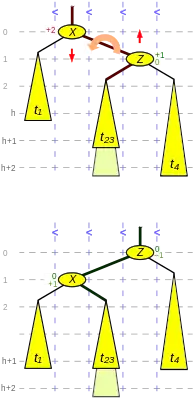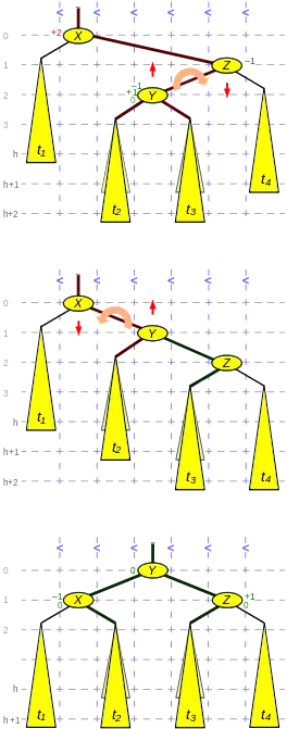 The result of the first, the right, rotation is shown in the middle third of the figure. (With respect to the balance factors, this rotation is not of the same kind as the other AVL single rotations, because the height difference between Y and t4 is only 1.) The result of the final left rotation is shown in the lower third of the figure. Five links (thick edges in figure 3) and three balance factors are to be updated.
