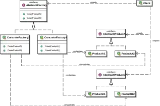 The abstract factory pattern in software engineering is a design pattern that provides a way to create families of related objects without imposing their concrete classes, by encapsulating a group of individual factories that have a common theme without specifying their concrete classes.[1] According to this pattern, a client software component creates a concrete implementation of the abstract factory and then uses the generic interface of the factory to create the concrete objects that are part of the family. The client does not know which concrete objects it receives from each of these internal factories, as it uses only the generic interfaces of their products.[1] This pattern separates the details of implementation of a set of objects from their general usage and relies on object composition, as object creation is implemented in methods exposed in the factory interface.[2]