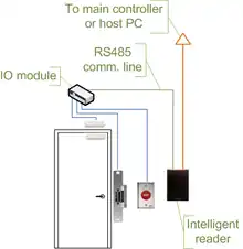 - Intelligent readers: have all inputs and outputs necessary to control door hardware; they also have memory and processing power necessary to make access decisions independently. Like semi-intelligent readers, they are connected to a control panel via an RS-485 bus. The control panel sends configuration updates, and retrieves events from the readers. Examples of such readers could be InfoProx IPO200 by CEM Systems, and AP-500 by Apollo. There is also a new generation of intelligent readers referred to as "IP readers". Systems with IP readers usually do not have traditional control panels, and readers communicate directly to a PC that acts as a host.