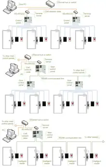 3. Serial main controllers & intelligent readers. All door hardware is connected directly to intelligent or semi-intelligent readers. Readers usually do not make access decisions, and forward all requests to the main controller. Only if the connection to the main controller is unavailable, will the readers use their internal database to make access decisions and record events. Semi-intelligent reader that have no database and cannot function without the main controller should be used only in areas that do not require high security. Main controllers usually support from 16 to 64 readers. All advantages and disadvantages are the same as the ones listed in the second paragraph.