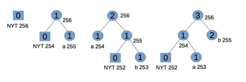 NYT spawns two child nodes: 254 and 255, both with weight 0. Increase weight for root and 255. Code for "a", associated with node 255, is 1.