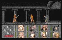 The eight heroes from the Dragonlance series are assembled for the quest, but only one is visible on the screen at a time; when the on-screen hero dies, the next in line appears.[2] Heroes of the Lance uses Dungeons & Dragons game statistics, with character statistics taken exactly from the rule books.[3] Three characters have special abilities (healing magic, wizard magic, and trap removal), but the other five merely act as "lives" for the player as in traditional action-platforming games.