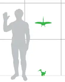The wings were long, and the wing membranes appear to have lacked the furry covering of pycnofibres present in some other pterosaurs (such as Pterorhynchus and Jeholopterus). The wing membrane extended between the fingers and toes as webbing, and a uropatagium (secondary membrane between the feet and tail) was present, as well as a propatagium (membrane between the wrist and shoulder).[7] Both the finger and toe claws were covered in keratin sheaths that extended and curved into sharp hooks well beyond their bony cores.[6]