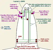 An air data module is a component of the navigation system.[1] Each unit converts pneumatic (air pressure) information from a pitot tube or a static port into numerical information which is sent on a data bus.[2] This pressure information is received and processed by the Air Data Reference (ADR) component of the Air Data Inertial Reference Unit (ADIRU).[1] This processed information is then sent to one or more display management computers that present information on the cockpit's primary flight display.[3] Airspeed information is also sent to the flight computers and other electronics,[4] including the autoflight subsystem (e.g. flight management and guidance system).[5]