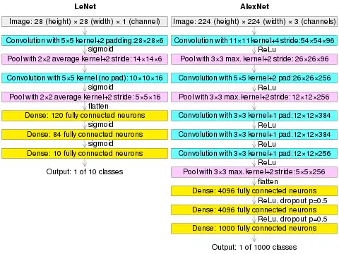 (AlexNet image size should be 227×227×3, instead of 224×224×3, so the math will come out right. The original paper said different numbers, but Andrej Karpathy, the former head of computer vision at Tesla, said it should be 227×227×3 (he said Alex didn't describe why he put 224×224×3). The next convolution should be 11×11 with stride 4: 55×55×96 (instead of 54×54×96). It would be calculated, for example, as: [(input width 227 - kernel width 11) / stride 4] + 1 = [(227 - 11) / 4] + 1 = 55. Since the kernel output is the same length as width, its area is 55×55.)