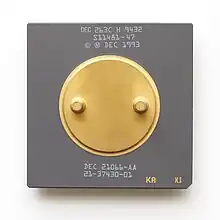 The 21064 is packaged in a 431-pin alumina-ceramic pin grid array (PGA) measuring 61.72 mm by 61.72 mm.[17] Of the 431 pins, 291 were for signals and 140 were for power and ground.[14][18] The heatsink is directly attached to the package, secured by nuts attached to two studs protruding from the tungsten heat spreader.