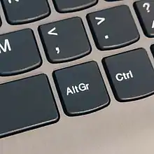 AltGr (also Alt Graph) is a modifier key found on many computer keyboards (rather than a second Alt key found on US keyboards). It is primarily used to type special characters and symbols that are not widely used in the territory where sold, such as foreign currency symbols, typographic marks and accented letters.[1] On a typical Windows-compatible PC keyboard, the AltGr key, when present, takes the place of the right-hand Alt key. The key at this location will operate as AltGr if a keyboard layout using AltGr is chosen in the operating system, regardless of what is engraved on the key.[2] In macOS, the Option key has functions similar to the AltGr key.