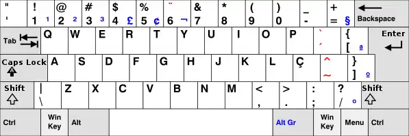 The Finnish multilingual keyboard standard adds many new characters to the traditional layout via the AltGr key, as shown in the image below (the blue characters can be written with the AltGr key; several dead key diacritics, shown in red, are also available as an AltGr combination).[8][9]