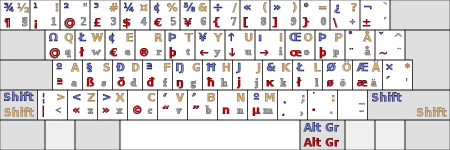 Below are some diagrams and examples of country-specific key maps. For the diagrams, the grey symbols are the standard characters, yellow is with ⇧ Shift, red is with AltGr, and blue is with ⇧ Shift+AltGr.