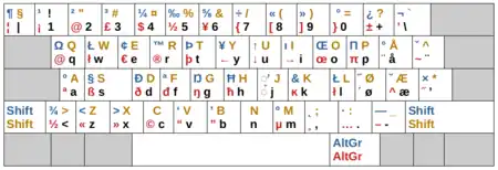 | ¬ ◌ ◌ ¦ | ! ¡ 1 ¹ | " ½ 2 ◌ | £ ⅓ 3 ³ | $ ¼ 4 € | % ⅜ 5 ½ | ^ ⅝ 6 ◌ | & ⅞ 7 { | * ™ 8 [ | ( ± 9 ] | ) ° 0 } | _ ¿ - \ | + ◌ = ◌ |