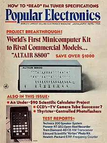 The Altair 8800 is a microcomputer designed in 1974 by MITS and based on the Intel 8080 CPU.[2] Interest grew quickly after it was featured on the cover of the January 1975 issue of Popular Electronics[3] and was sold by mail order through advertisements there, in Radio-Electronics, and in other hobbyist magazines.[4][5] According to Harry Garland, the Altair 8800 was the product that catalyzed the microcomputer revolution of the 1970s.[6] It was the first commercially successful personal computer.[7] The computer bus designed for the Altair was to become a de facto standard in the form of the S-100 bus, and the first programming language for the machine was Microsoft's founding product, Altair BASIC.[8][9]
