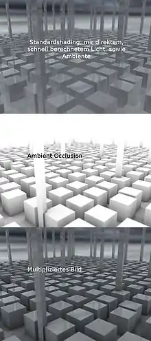 Ambient occlusion can be seen as an accessibility value that is calculated for each surface point.[1] In scenes with open sky, this is done by estimating the amount of visible sky for each point, while in indoor environments, only objects within a certain radius are taken into account and the walls are assumed to be the origin of the ambient light. The result is a diffuse, non-directional shading effect that casts no clear shadows, but that darkens enclosed and sheltered areas and can affect the rendered image's overall tone. It is often used as a post-processing effect.