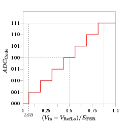 An ADC has several sources of errors. Quantization error and (assuming the ADC is intended to be linear) non-linearity are intrinsic to any analog-to-digital conversion. These errors are measured in a unit called the least significant bit (LSB). In the above example of an eight-bit ADC, an error of one LSB is 1⁄256 of the full signal range, or about 0.4%.