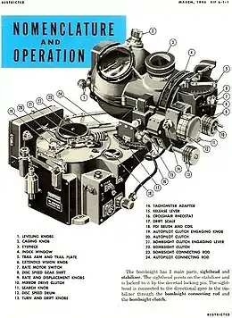 A page from the Bombardier's Information File (BIF) that describes the components and controls of the Norden bombsight. It was a highly sophisticated optical/mechanical analog computer used by the United States Army Air Force during World War II, the Korean War, and the Vietnam War to aid the pilot of a bomber aircraft in dropping bombs accurately.