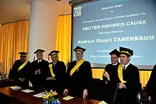 - On October 7, 2011, Universitatea Petru Maior din Târgu Mureș (Petru Maior University of Târgu Mureș) granted Tanenbaum the Doctor Honoris Causa (honorary doctorate) title for his remarkable work in the field of computer science and achievements in education. The academic community is hereby honoring his devotion to teaching and research with this award. At the ceremony, the Chancellor, the Rector, the Dean of the Faculty of Sciences and Letters, and others all spoke about Tanenbaum and his work. The pro-rector then read the 'laudatio,' summarizing Tanenbaum's achievements. These include his work developing MINIX (the predecessor to Linux), the RFID Guardian, his work on Globe, Amoeba, and other systems, and his many books on computer science, which have been translated in many languages, including Romanian, and which are used at Petru Maior University.