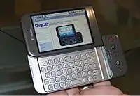 Speculation about Google's intention to enter the mobile communications market continued to build through December 2006.[25] An early prototype had a close resemblance to a BlackBerry phone, with no touchscreen and a physical QWERTY keyboard, but the arrival of 2007's Apple iPhone meant that Android "had to go back to the drawing board".[26][27] Google later changed its Android specification documents to state that "Touchscreens will be supported", although "the Product was designed with the presence of discrete physical buttons as an assumption, therefore a touchscreen cannot completely replace physical buttons".[28] By 2008, both Nokia and BlackBerry announced touch-based smartphones to rival the iPhone 3G, and Android's focus eventually switched to just touchscreens. The first commercially available smartphone running Android was the HTC Dream, also known as T-Mobile G1, announced on September 23, 2008.[29][30]