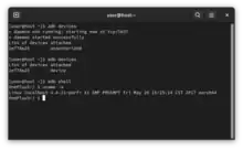 ![]() Starting the adb server in GNOME Terminal, which then enumerates the devices. After that, a shell is opened on the device being debugged to run the uname command. | |