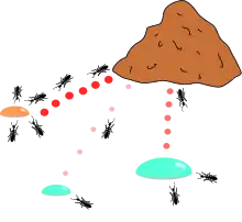 In the natural world, ants of some species (initially) wander randomly, and upon finding food return to their colony while laying down pheromone trails. If other ants find such a path, they are likely not to keep travelling at random, but instead to follow the trail, returning and reinforcing it if they eventually find food (see Ant communication).[9]