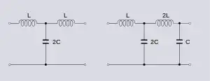 Symmetric and antimetric networks are often also topologically symmetric and antimetric, respectively. The physical arrangement of their components and values are symmetric or antimetric as in the ladder example above. However, it is not a necessary condition for electrical antimetry. For example, if the example networks of figure 1 have an additional identical T-section added to the left-hand side as shown in figure 2, then the networks remain topologically symmetric and antimetric. However, the network resulting from the application of Bartlett's bisection theorem[2] applied to the first T-section in each network, as shown in figure 3, are neither physically symmetric nor antimetric but retain their electrical symmetric (in the first case) and antimetric (in the second case) properties.[3]
