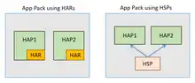 When multiple HAPs reference the same HAR, the HSP can be used instead to share some state variables and reduce the size of an App Pack. However, the HSP has some restrictions; for example, it does not support the declaration of abilities in its configuration file and its invoking modules must be in the same stage model as with the HSP.[14]