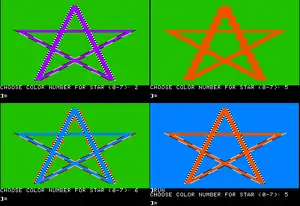 The Lo-Res graphics mode offered built-in commands to clear the screen, change the drawing color, plot individual pixels, plot horizontal lines, and plot vertical lines. There was also a "SCRN" function to extract the color stored in any pixel, one lacking in the other modes.