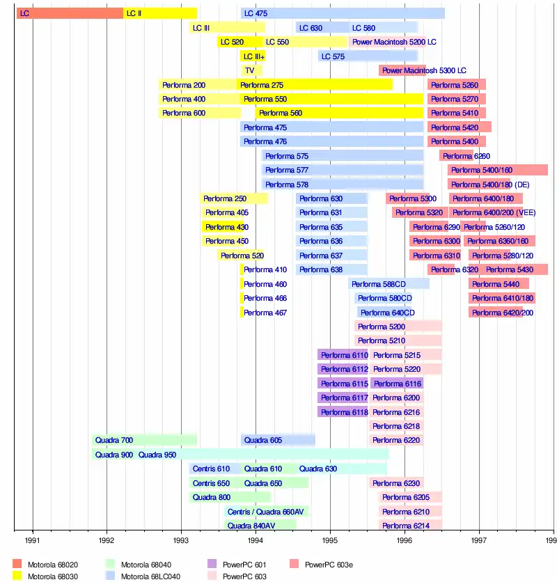 | Timeline of Macintosh Centris, LC, Performa, and Quadra models, colored by CPU type |