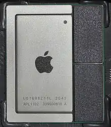 ![]() Image of an M1 processor inside the 2020 Mac Mini. The two chips on the right are the LPDDR4X memory | |